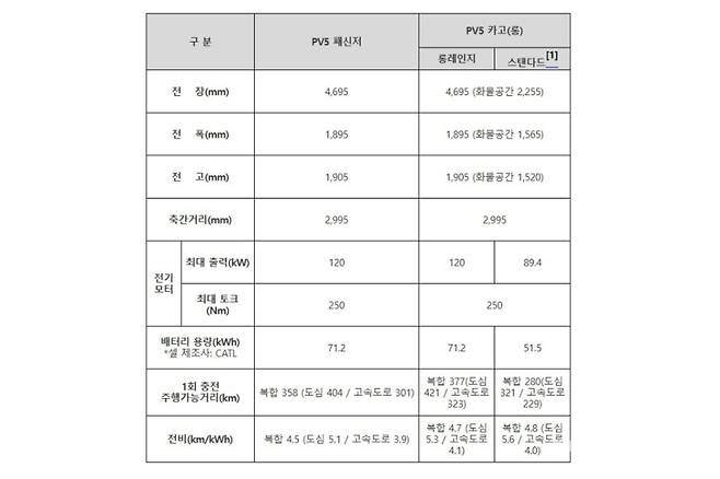 PV5 카고는 71.2kWh 배터리의 롱레인지와 51.5kWh의 스탠다드로 운영된다. 1회 완충시 주행거리는 산업부 기준 각각 377km, 280km다. PV5 카고는 양문형 테일게이트의 열림 각도를 95도, 180도로 설정할 수 있으며, V2L, L-트랙 마운팅 등을 제공한다.