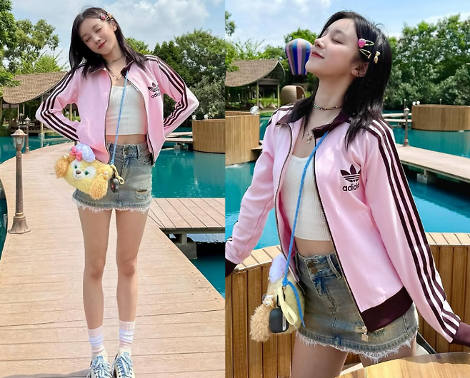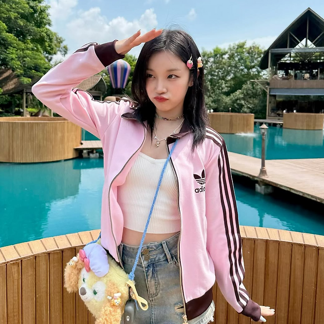 우기는 편안한 캐주얼 룩을 선보였다. 핑크색 아디다스 트랙탑에 화이트 탑을 매치하여 상큼하고 활동적인 이미지를 강조했다. 또한, 청바지 숏데님 팬츠와 귀여운 강아지 캐릭터 크로스백을 착용하여 젊고 트렌디한 분위기를 자아냈다.