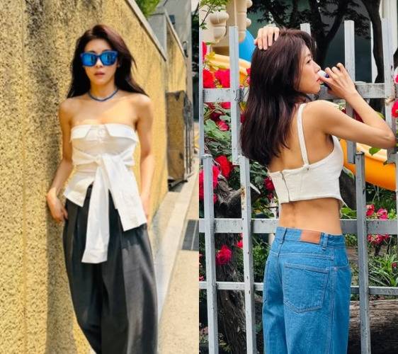 특히 구조적인 리본 장식이 돋보이는 화이트 튜브톱은 백리스 디자인으로 뒤태까지 시선을 끌었으며, 단순한 길거리 스냅조차 화보처럼 만들어버리는 하지원의 존재감은 여전했다. 여기에 진청 롱 데님 팬츠와 짙은 블루 컬러의 선글라스를 매치해 도회적인 분위기를 더했다. 스트리트 무드와 클래식 감성을 넘나드는 센스 있는 스타일링이 돋보였다.