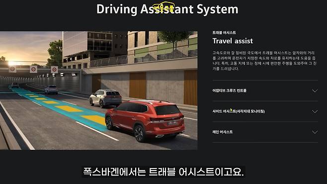 운전자 보조 시스템으로는 앞차 거리를 인식해서 속도와 차로를 유지하는 트래블 어시스트, 어댑티브 크루즈 컨트롤, 사각지대 모니터링 시스템인 사이드 어시스트 등이 제공됩니다.