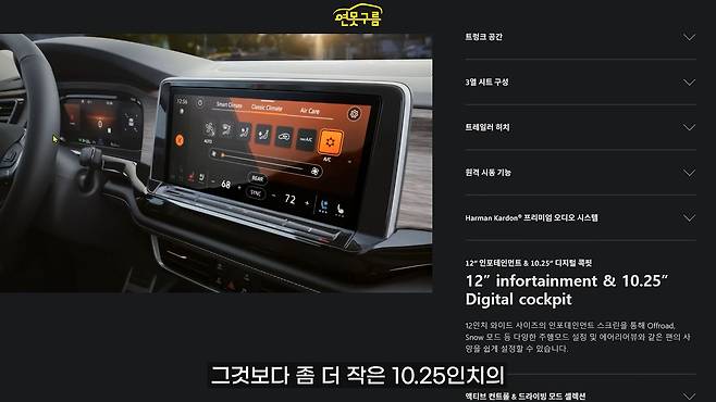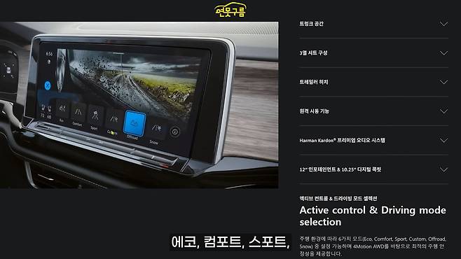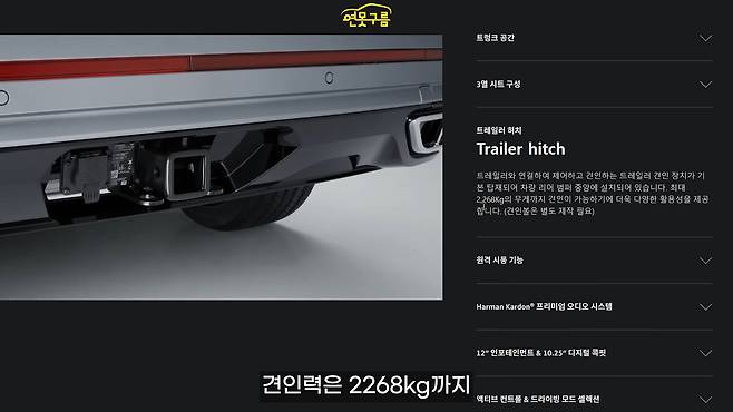 최대 2,268kg까지 견인 가능해서 웬만한 대형급 견인이 가능하고요. 원격 시동 기능도 제공됩니다. 하만카돈 오디오 시스템이 들어가는데, 아주 화려하지는 않지만 기본기가 괜찮다고 하고요.
