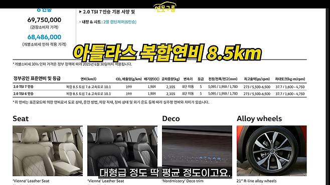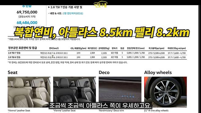폭스바겐 아틀라스의 복합 연비는 리터당 8.5킬로미터, 도심 7.6, 고속도로 10.1입니다. 대형 SUV 평균 정도라고 볼 수 있겠네요. 팰리세이드 21인치 사륜 구동 모델의 복합 연비는 리터당 8.2킬로미터, 도심 7.2, 고속도로 9.8이니까요. 연비 면에서는 아틀라스가 근소하게 우세합니다.