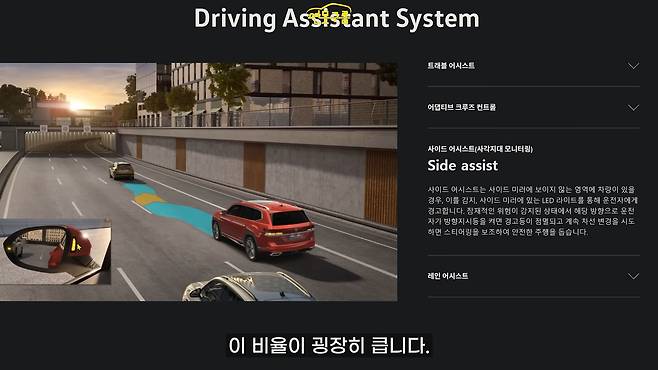 특히 폭스바겐의 사각지대 경고등은 크기가 커서 운전석에서 더 잘 보인다는 장점이 있어요. 차선 유지 시스템인 레인 어시스트도 당연히 있고요.