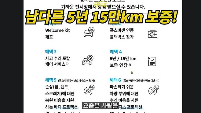 수입차 브랜드들이 보통 2년 또는 3년의 보증 기간을 제공하는 것과 달리, 폭스바겐은 무려 5년 또는 15만 킬로미터의 보증 기간을 제공합니다. 이건 정말 엄청난 차이인데요. 다른 수입차의 경우 보증 연장에 400만 원 이상의 비용이 들기도 하는 점을 고려하면 폭스바겐의 5년, 15만 킬로미터 보증은 수입차 구입 시 꼭 꼼꼼하게 따져봐야 할 중요한 부분이라고 강조하고 싶네요.