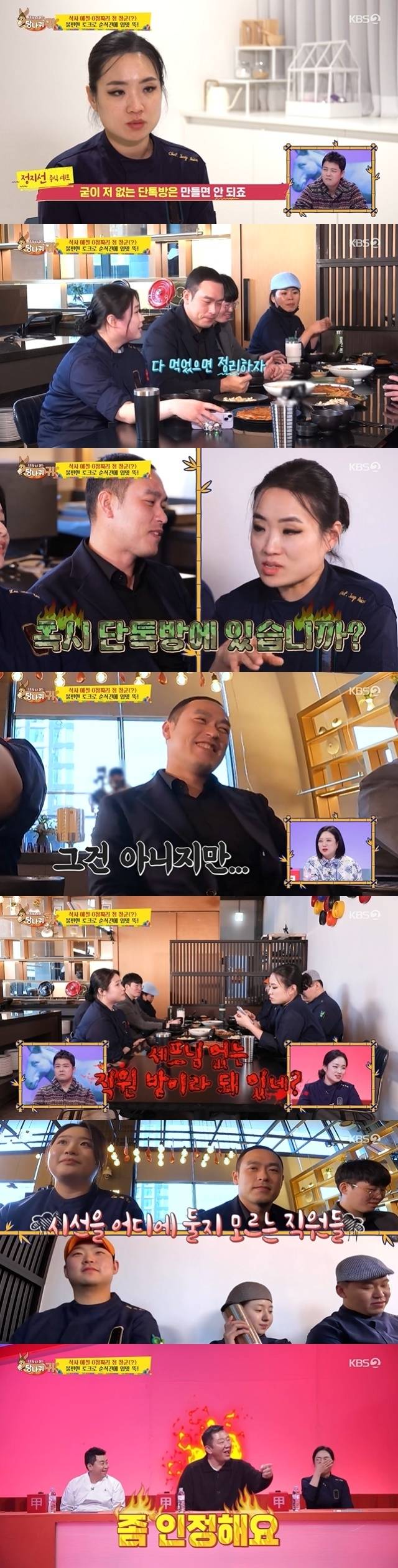 VCR 속의 직원들은 정지선의 남편인 대표를 주축으로 서둘러 식사 자리를 정리하며 질문에 대한 답을 회피하려 했지만 정지선은 이들을 다시 자리에 앉혔다. 그러곤 결국 직원 단톡방을 찾는 데 성공, "'세프님 없는 직원 방'이라고 써있네. 진짜 아니다. 만들지 마라. 걸리기만 해보라 아주"라고 단호히 경고했다. 심지어 정지선은 남편인 대표까지도 "혹시 단톡방에 들어가 있냐"고 의심하는 모습을 보였다.