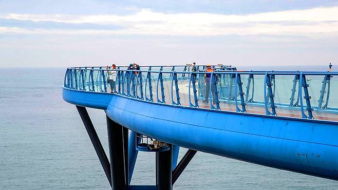 해수면에서 약 20m 위에 떠 있는 이 전망대는, 끝자락에 설치된 반달 모양의 투명 바닥 덕분에 마치 공중을 걷는 듯한 아찔한 체험을 제공합니다.