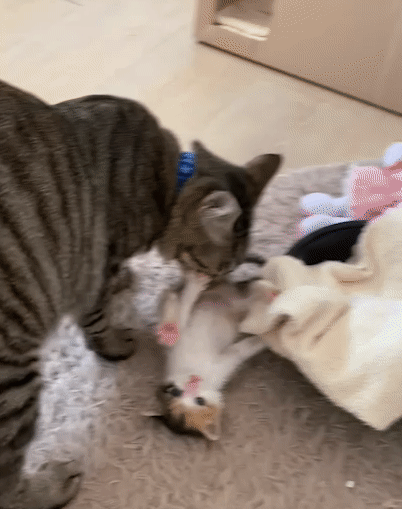 아래 이미지는 이 집에 살고 있던 고양이가 가족으로 맞이한 아깽이를 엄마처럼 돌봐주는 모습입니다. 아깽이는 바닥에 완전히 등을 대고 드러누워서 고양이에게 몸을 맡기고 있는데요. 기분이 얼마나 좋은지 자신을 정성껏 핥아주는 고양이를 물끄러미 바라봅니다.