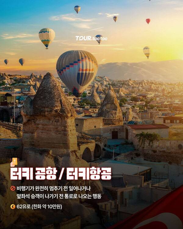 터키 일부 공항이나 터키항공 기내에서 비행기가 완전히 멈추기 전 자리에서 일어나거나, 앞좌석 승객이 나가기 전 통로로 나올 경우 62유로(약 10만원)의 벌금이 부과됩니다.