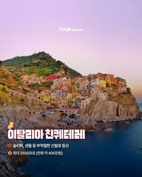 다섯 개의 해안 마을이 절경을 이루는 세계문화유산 지역 친퀘테레에서는 슬리퍼나 샌들 등 부적절한 신발을 신고 등산하면 최대 2,500유로(약 405만원)의 벌금이 부과됩니다.