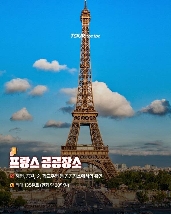 프랑스는 최근 일부 해변가에만 적용되던 흡연 벌금을 전국으로 확대했습니다. 공원과 숲, 해변과 학교 인근 등 공공장소에서 흡연 시 최대 135유로(약 20만원)의 벌금이 부과됩니다.
