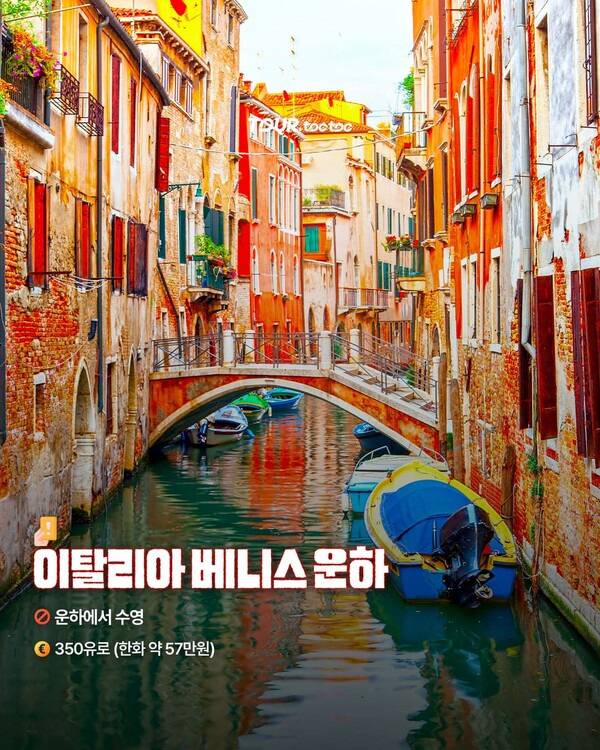 ‘물의 도시’라 불리는 세계적인 관광 명소 베니스운하는 오버투어리즘으로 곤욕을 겪고 있는 도시로도 유명하죠. 베니스 운하에서 수영하면 350유로(약 57만원)의 벌금이 부과됩니다.