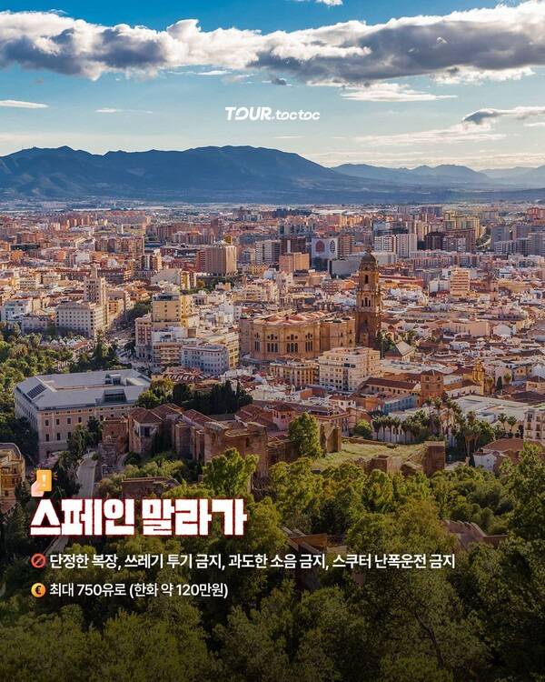 피카소의 고향이자 지중해 리조트 도시인 말라가입니다. 말라가에 머무는 관광객을 대상으로 캠페인이 진행되고 있는데요. 단정한 복장, 쓰레기 투기 금지, 과도한 소음 금지, 스쿠터 난폭운전 금지 위반 시 최대 750유로(약 120만원)의 벌금이 부과됩니다.