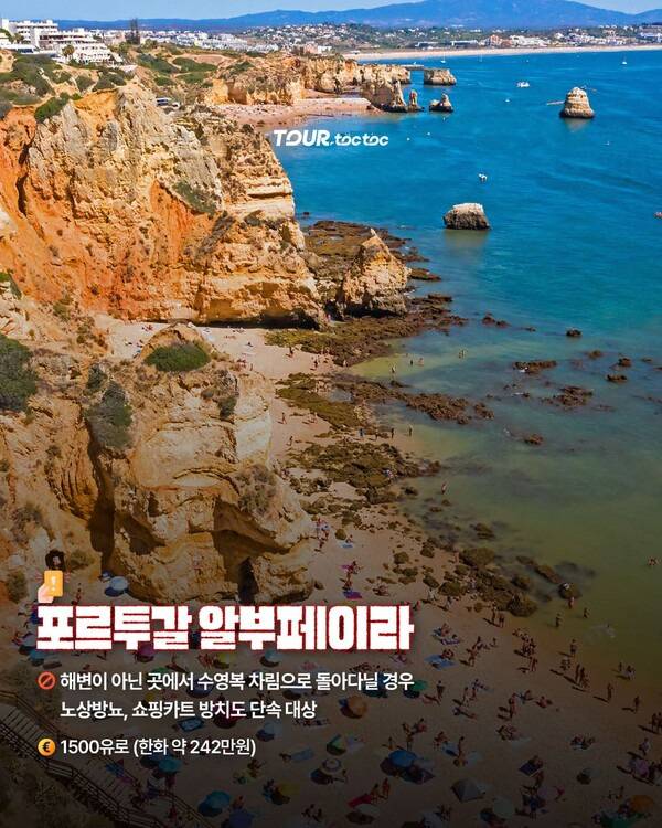 알부페이라는 남부 알가르브 해안에 위치한 아름다운 해변 휴양지입니다. 해변이 아닌 곳에서 수영복 차림으로 돌아다니면 최대 1,500유로(약 242만원)의 벌금이 부과됩니다. 노상방뇨, 쇼핑카트 방치도 단속 대상입니다.
