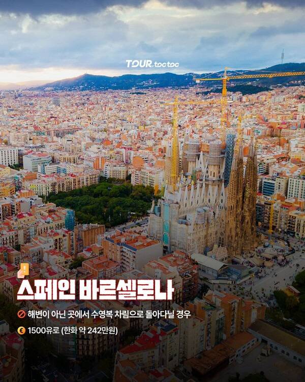 스페인 바르셀로나는 가우디 건축과 해변이 공존하는 인기 여행지인데요. 해변이 아닌 장소에서 수영복 차림일 경우 최대 1,500유로(약 242만원)의 벌금이 부과됩니다.