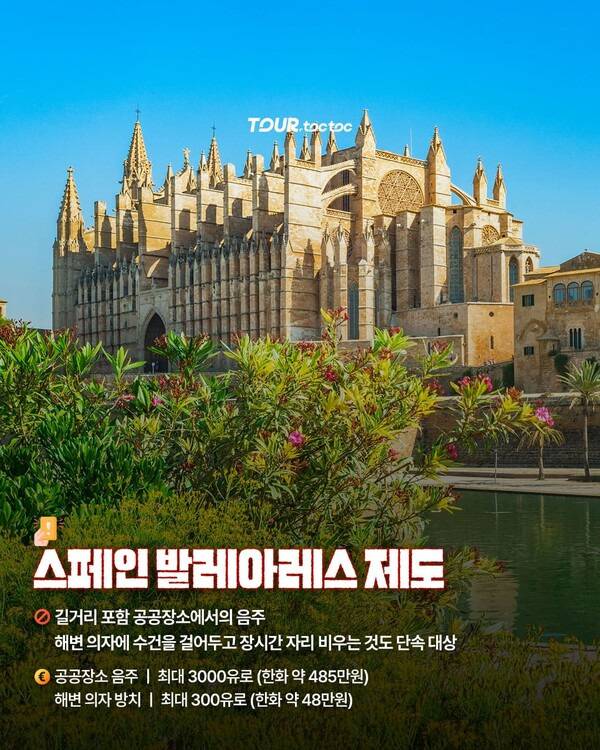 발레아레스 제도 내에서 길거리 및 공공시설 음주는 최대 3,000유로(약 485만원), 해변 의자에 수건을 걸어두고 장시간 자리를 비우면 최대 300유로(약 48만원)의 벌금이 부과됩니다.