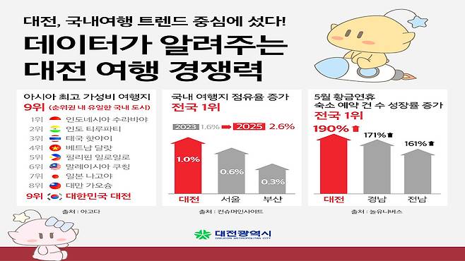 특히 5월 황금연휴 기간 동안 대전의 숙박 예약 건수는 전년 대비 190%나 급증하며 전국 1위를 차지했다.