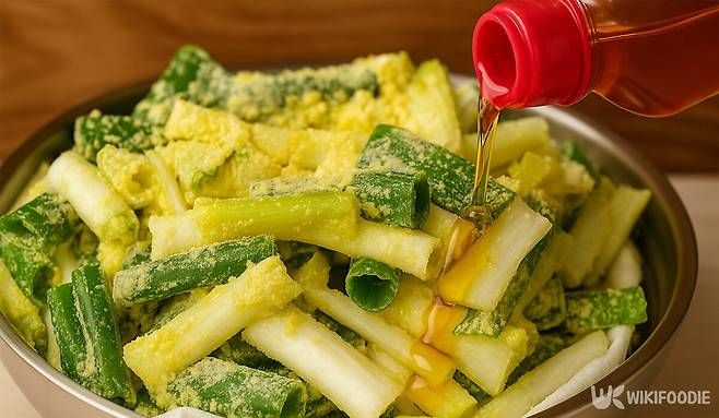 다 찐 대파에 들깻가루 1큰술을 넣고 고루 섞어 마무리한다. 이때 소금 1/2큰술을 나눠 넣으며 간을 조절한다. 한꺼번에 넣으면 짜지거나 뭉칠 수 있으므로 솔솔 뿌려가며 버무리는 것이 좋다. 마지막에 참기름을 한두 방울 두르면 더욱 고소한 맛이 추가된다.