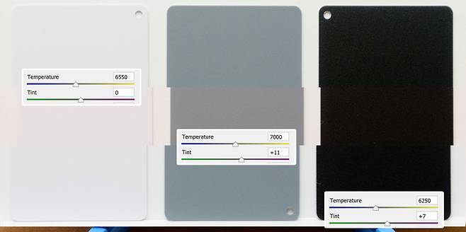 하얀색과 검은색도 찍어보니 이쪽도 색온도가 지멋대로 이더군요. (원래 흰검은 화밸 테스트하기 안 좋습니다만)