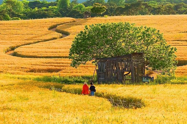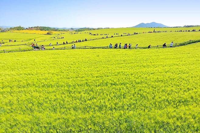 S자형 흙길을 따라 걷다 보면 바람에 살랑이는 보리의 향연이 발아래 펼쳐지고, 이따금 들려오는 노랫가락처럼 마음도 가벼워집니다. 청보리밭 사이사이에는 노란 유채꽃도 어우러져 봄의 풍경을 더욱 풍성하게 만들어줍니다.