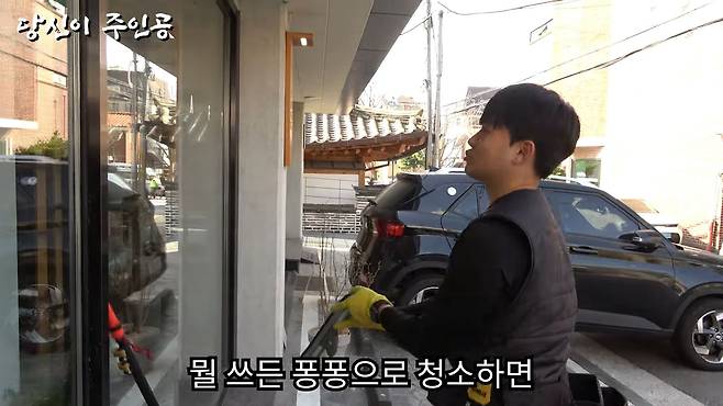 이 기계는 고압기인데, 엄청 비싼 200만 원짜리입니다. 이걸 쓰면 확실히 차이가 나서 고객들의 만족도가 높죠. 청소하다 보면 물이 다 튀는데, 저는 옆 가게들까지 가볍게 닦아드려요. 너무 깨끗하게 해드리면 원래 돈 주고 청소하는 곳에서 질투할 수도 있으니 약식으로 하는 거죠.