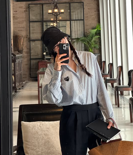 이청아는 패션에서도 개성을 뽐내고 있습니다. 최근 공개된 그녀의 패션에서 이청아는 스트라이프 셔츠에 블랙 숏팬츠를 매치하여 시원하고 캐주얼한 매력을 선보였습니다.