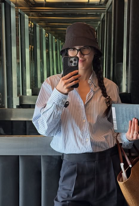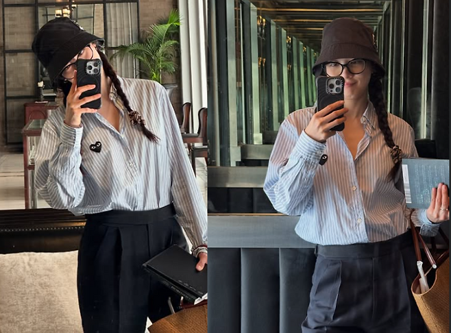 그녀는 양갈래로 땋은 머리와 함께 버킷햇을 착용하여 보다 친근하고 편안한 분위기를 연출했으며, 뿔테 안경을 더해 세련된 스타일을 완성했습니다.