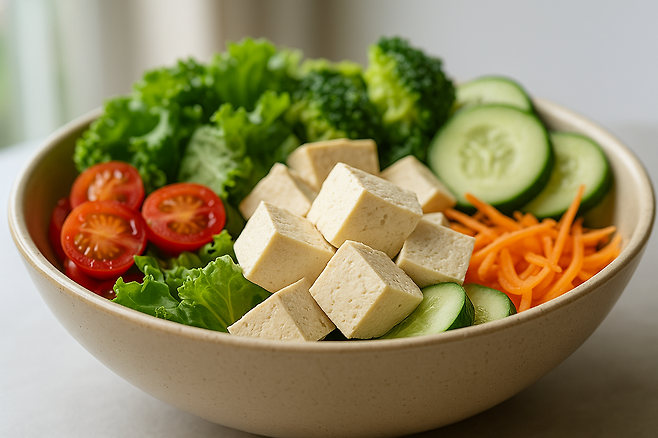 미자가 공개한 식단의 핵심은 ‘가벼운 포만감’입니다. 식이섬유가 풍부한 채소와 단백질이 풍부한 두부를 조합해 포만감을 느끼면서도 열량을 낮춘 점이 특징입니다.