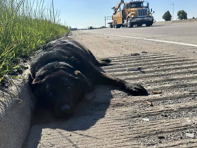 검은색 강아지는 도로 가장자리에서 쓰러진 채 있었고 그 곁에는 단 한순간도 떨어지지 않고 함께 있는 친구가 있었다.