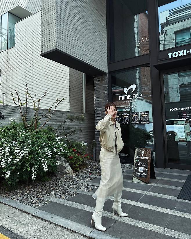 전미도는 베이지 계열의 시스루 롱스커트와 짧은 재킷, 그리고 화이트 롱부츠를 조화롭게 매치했다. 전체적으로 톤온톤 스타일링을 선보이며, 소재의 대비와 레이어드를 통해 감각적인 모던룩을 완성했다. 심플하면서도 트렌디한 무드가 돋보인다.