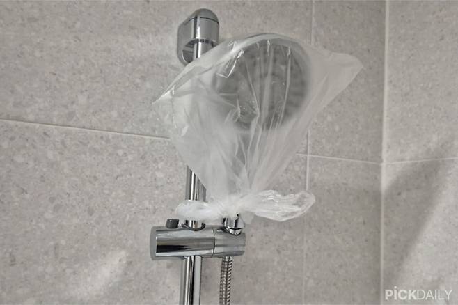 이후 샤워기가 들어갈만한 비닐봉투 하나를 준비해주세요. 비닐 봉투 대신 지퍼백을 이용해도 됩니다. 여기에 식초와 물을 1:1로 넣어 채워주세요. 식초물에 샤워기 헤드를 넣고 10분~15분 정도 담궈 기다려주면 되는데요. 식초의 효과로 물때와 세균을 효과적으로 제거 할 수 있습니다.