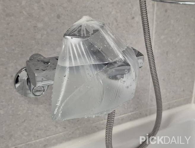 그 상태로 물을 틀어 비닐봉지 안을 가득 채워주면, 수도꼭지 입구가 식초물에 잠기게 되는데요. 이대로 10분~15분정도 기다려주면 수도꼭지의 입구도 청결하게 관리 할 수 있습니다.