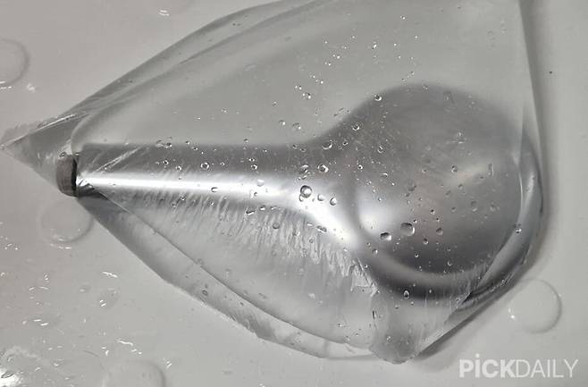 이를 수도꼭지 입구에 끼워준 뒤, 수도꼭지 끝부분이 봉투 안에 들어가도록 위로 묶어주거나 고무줄로 묶어 고정해주세요.