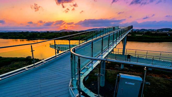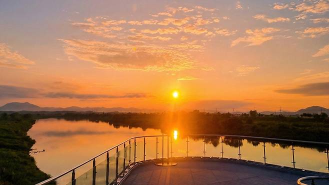 📸 인생샷 명당: 해 질 녘, 조망대 난간 끝에서 영산강 노을을 배경으로 한 실루엣 샷