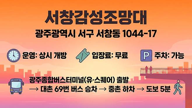 조망대는 24시간 상시 개방되어 언제든 방문할 수 있습니다. 낮의 풍경도 압도적이지만, 해가 완전히 지고 난 뒤 켜지는 야간 경관 조명은 영산강의 밤을 더욱 낭만적으로 만들어줍니다.
