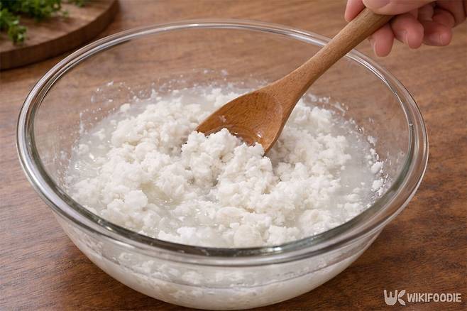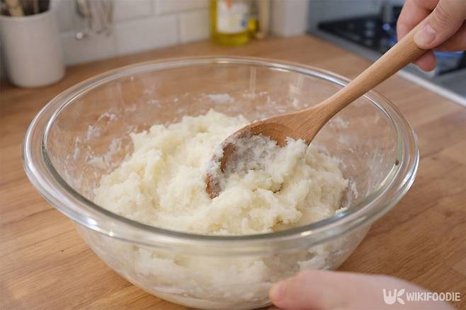 찹쌀가루와 뜨거운 물을 1대1 비율로 섞고, 여기에 설탕과 소금을 넣어 간을 맞춘다. 가루 덩어리가 보이지 않을 때까지 충분히 섞는 과정이 중요하다.