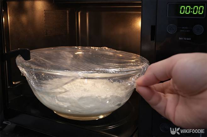 전자레인지를 이용하면 떡 반죽을 빠르게 익힐 수 있다. 반죽을 담은 그릇에 랩을 씌우고 구멍을 살짝 낸 뒤 가열한다. 조리는 두 번에 나눠 진행한다.