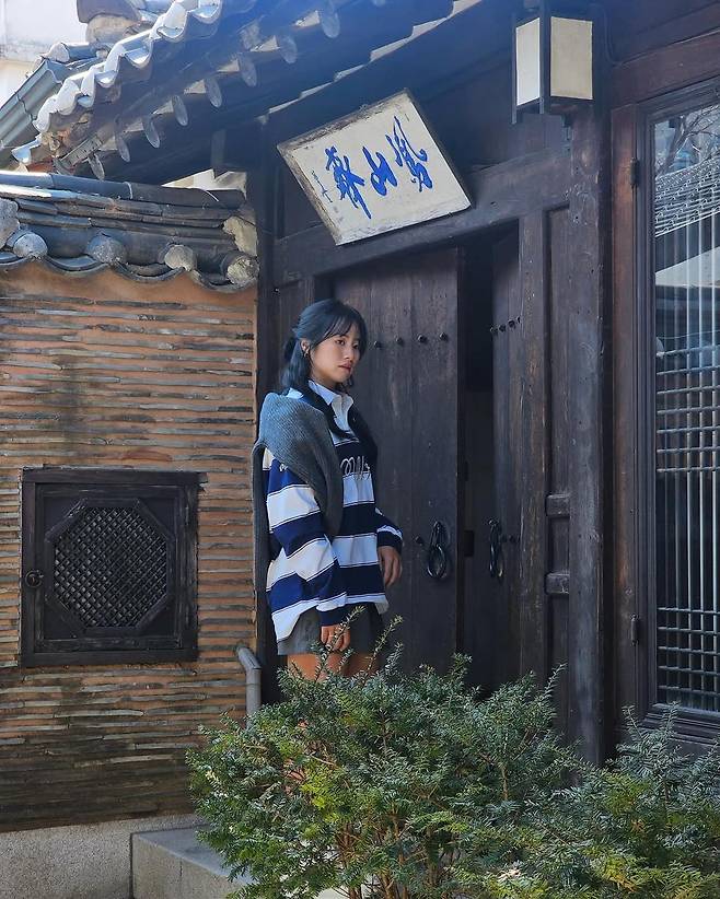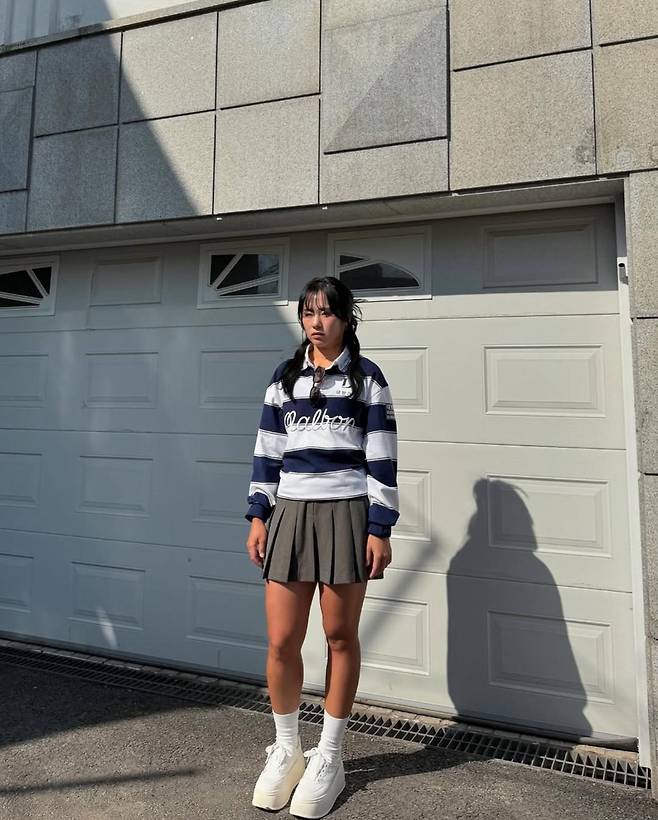 공개된 사진 속 이정은6은 네이비와 화이트 스트라이프 패턴이 돋보이는 럭비 티셔츠를 착용했다. 캐주얼한 무드를 더하는 와이드 칼라 디자인과 여유로운 핏이 편안하면서도 스타일리시한 느낌을 연출했다. 여기에 카키 컬러의 플리츠 미니스커트를 매치해 단정하면서도 활동적인 분위기를 강조했다.