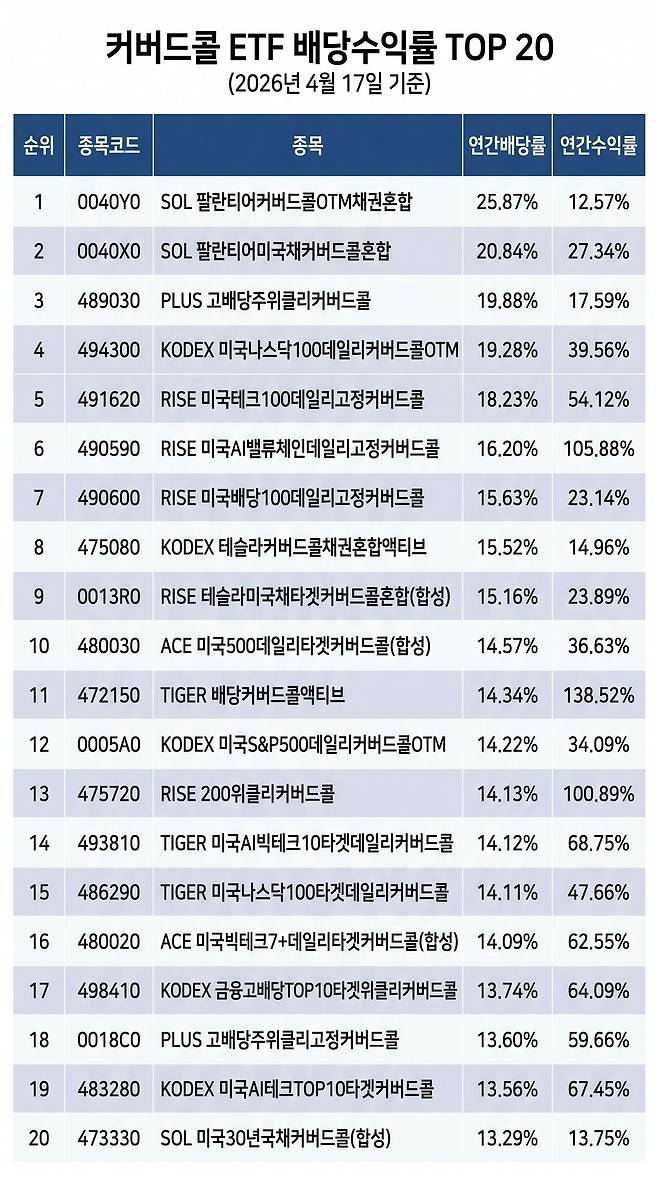 오늘은 커버드콜 ETF가 정확히 어떤 구조인지, 그리고 현재 국내에 상장된 상품 중 연간 배당률 상위 TOP 20까지 한 번에 정리해 드리겠습니다.