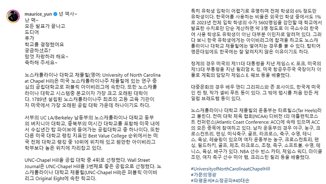 그러면서 윤민수는 미국 노스캐롤라이나대 채플힐에 대해 설명하는 글을 적었는데, 그는 “노스캐롤라이나대학교는 연구 중심의 공립대학교로 퍼블릭 아이비리그에 속한다”며 “미국에서 가장 오래된 공립 대학 중 하나”라고 설명했습니다.