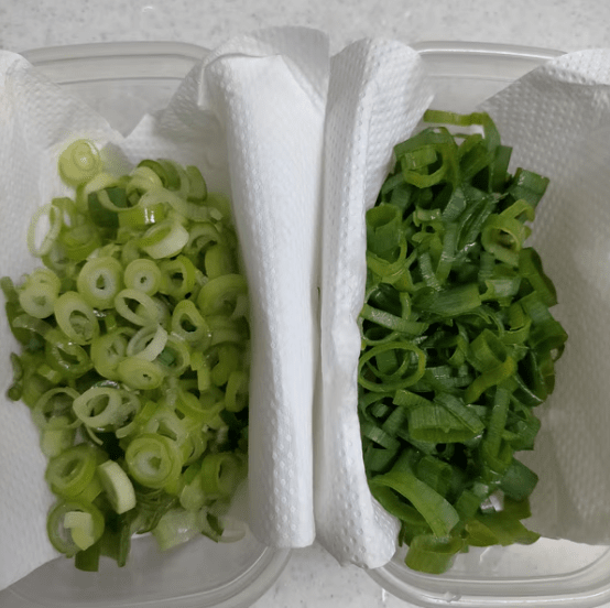 가장 기본이 되는 보관법은 밀폐용기에 보관하되, 용기 바닥에 키친타월을 두세 겹 깔아주는 것이다. 키친타월이 썰어놓은 대파에서 나오는 잔여 수분을 흡수하면서 전체적인 습도 조절을 도와준다.