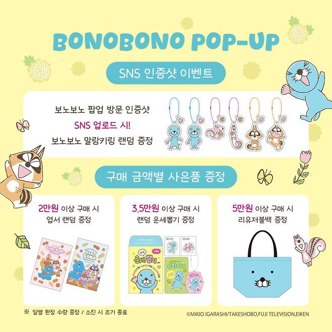 귀여운 보노보노를 좋아하는 분들에게 반가운 소식입니다. 오는 2월 19일부터 3월 16일까지, 잠실 롯데월드 부스럭 어드벤처점에서 보노보노 팝업스토어가 진행됩니다. 일본 직수입 한정판 굿즈부터 한정 프레임 포토부스, 구매 금액별 특별한 사은품까지 다양한 이벤트가 준비되어 있는데요.