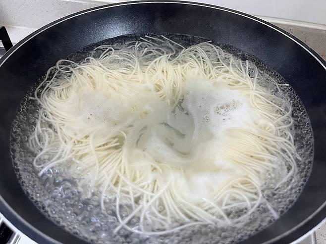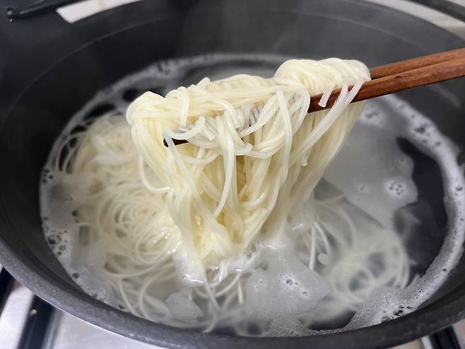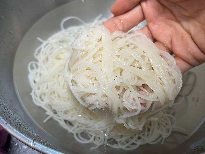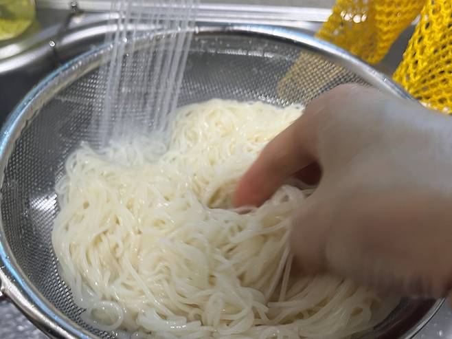 이럴 때 찬물에 여러 번 헹궈주면 면 표면에 남아 있던 전분이 제거되면서 훨씬 깔끔한 상태로 정리됩니다. 동시에 뜨거운 열기가 빠르게 식으면서 면이 단단하게 조여져, 탱탱하고 쫄깃한 식감이 살아나게 됩니다. 특히 손으로 가볍게 풀어주듯 헹궈주면 면발이 한 가닥씩 분리되면서 훨씬 먹기 좋은 상태가 됩니다. 국수는 최소한 3~4번 이상 헹궈야 전분기가 떨어져 나갑니다.