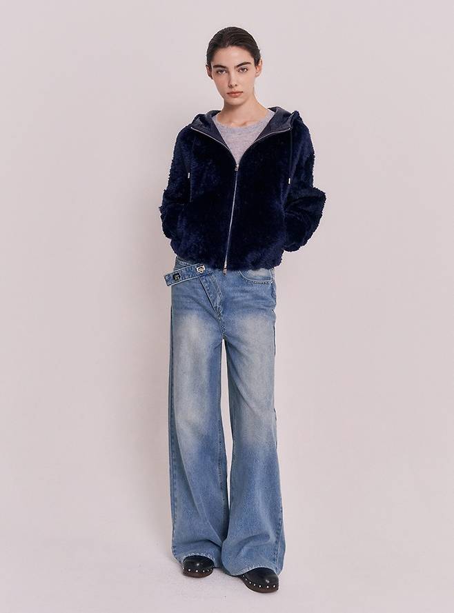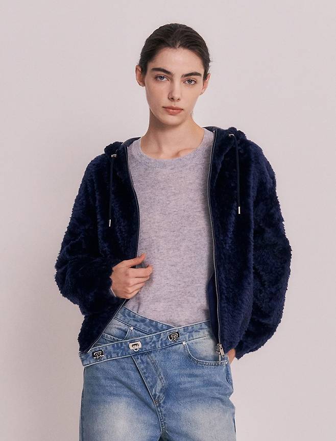 앞면 버클 오픈클로징과 실용적인 포켓으로 털 집업 재킷은 엉덩이가 살짝 덮이는 기장과 하이넥으로 발랄함과 실용성을 더했다.
