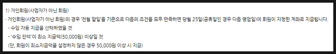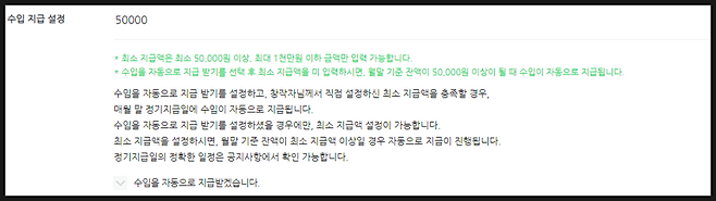 수입 자동 지급 선택을 하고 최소 지급액 50,000원 이상이면 당월 25일에 계좌로 입금되는데요.