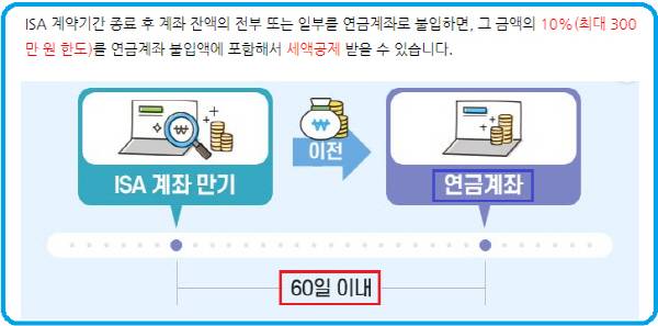ISA 수익금을 현금화한 후 연금저축계좌로 이전 시 주의 할 점은 ISA 만기일 또는 해지일로부터 60일 이내만 가능하다는 점이다. 이 기간을 놓치면 앞서 언급한 이체금액의 10%(최대 300만원)에 대한 세액공제 혜택을 받을 수 없다.