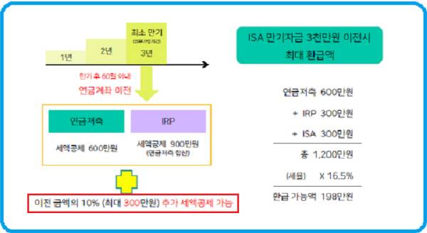 연금계좌는 연간 1800만 원까지만 납입이 가능하지만 ISA만기 자금을 연금계좌로 이체하면 이러한 한도 없이 얼마든지 추가 납입이 가능하다. 이때 이체금액의 10%(최대 300만원)까지 세액공제도 받을 수 있다. 기존 연금계좌가 900만원까지 세제혜택이 있으니 300만원까지 포함하게 되면 모두 1200만원까지 세액공제가 가능한 셈이다.