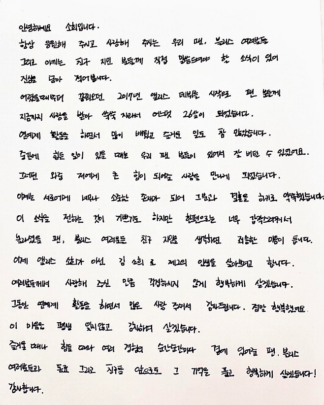 소희는 다음 달 아이오케이컴퍼니와의 전속계약 만료를 앞두고 있으나 재계약을 하지 않고 은퇴 소식도 전했습니다.