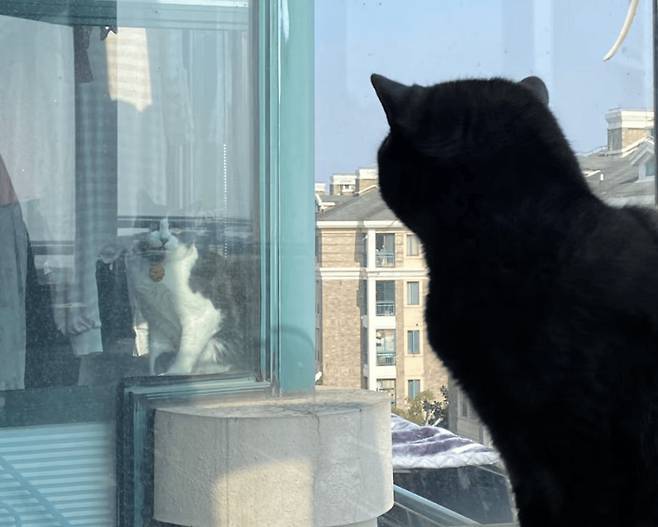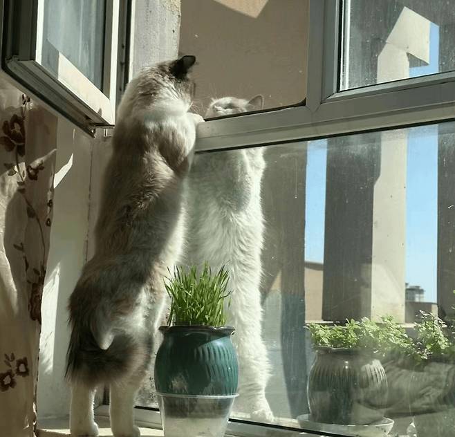 창가에 앉아 바깥 풍경을 구경하는 것을 좋아하는 고양이들이 많습니다. 그런데 간혹 창가 너머로 보이는 다른 고양이나 강아지를 보고 친구를 사귀기도 합니다.