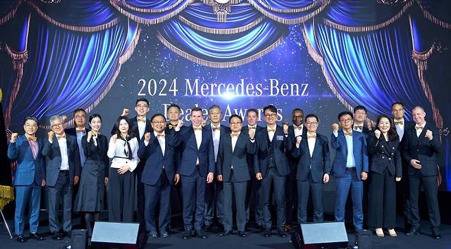 메르세데스-벤츠 코리아 및 메르세데스-벤츠 파이낸셜 서비스 코리아, 11개 공식 딜러사 임직원들이 15일 서울 반얀트리 클럽 앤 스파 서울에서 진행된 '2024 딜러 어워드'에서 시상식을 마친 후 기념 촬영을 하고 있다. 사진=메르세데스 벤츠 코리아
