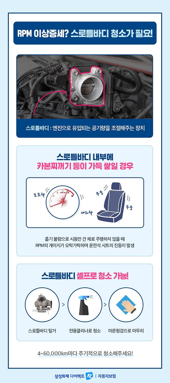 스로틀바디는 4~60000km 마다 주기적인 청소가 필요하며 청소 후에도 RPM에 이상증세가 있다면 점검을 통해 교체를 해야 합니다.